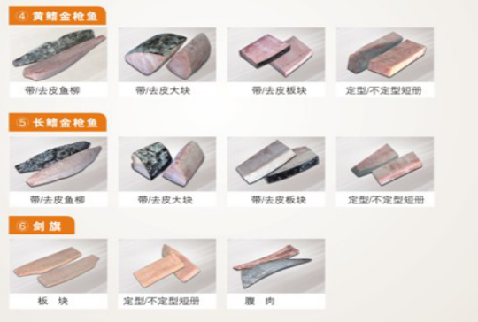 2、基本產(chǎn)品形態(tài):原魚、魚柳、魚段、大板、短冊、生魚片。